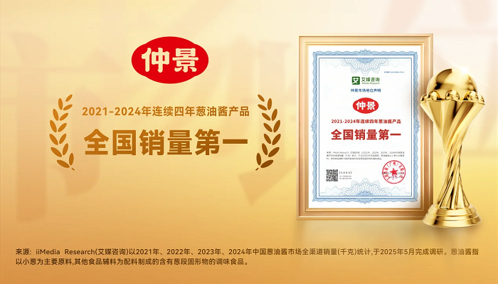 近日,仲景获全球领先的新经济产业第三方数据挖掘和分析机构iiMedia Research(艾媒咨询)授予的“2021-2024年连续四年葱油酱产品全国销量第一”市场地位确认。