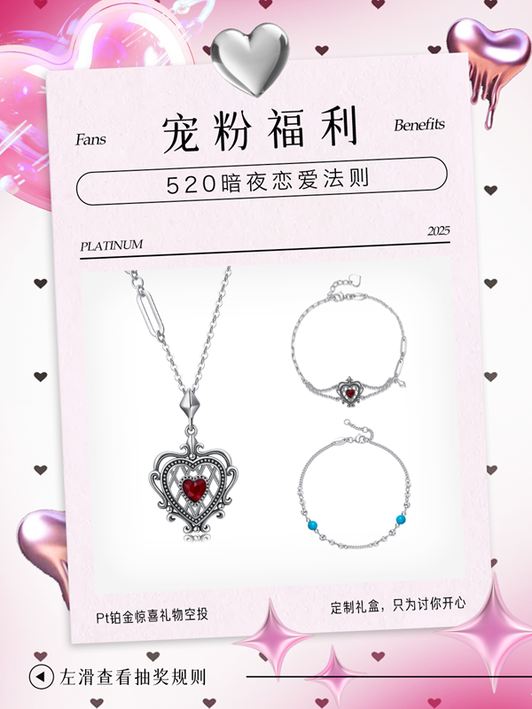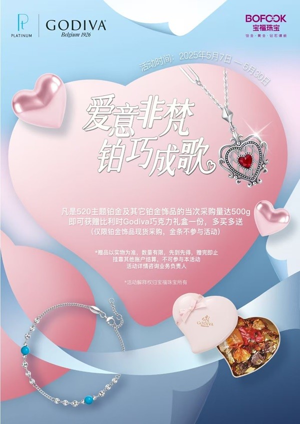 520这一重要情感节点,不仅是爱的表达时刻,也视为“韧真生活”态度的真实写照——既勇敢告白,也温柔自持。在营销前期,PGI® 携手知名珠宝生产商宝福珠宝共同推出以“爱”为主题的铂金新品系列 —— 用新潮设计铭刻永恒承诺,以柔韧、磨而不损的内涵表达对自己的肯定。经典爱心造型的新款项链及手链通过爱心造型搭配西式古典藤蔓、网格编织、珠边精饰等设计细节呈现复古时尚,采用电黑工艺、宝石面鎏彩与铂金特有的润白色泽呼应,演绎精致奢华的甜酷风格;以铂金镶嵌绿松石手链,寓意珍贵的纯净铂金搭配被誉为“幸运石”的绿松石,叠加多切面蹦迪珠,色彩上清新雅致,阳光下折射璀璨光芒,同时寓意向上、好运、守护与能量的全维注入。活动期间,消费者更有机会获赠 Godiva 巧克力,以“双重形式”礼赞爱情与自爱并重的生活理念。