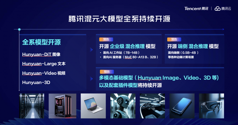 腾讯云副总裁、腾讯混元大模型技术负责人王迪介绍,目前,混元已实现图像、视频、3D、文本等在内的全模态开源,未来将推出多尺寸混合推理模型,从0.5B到32B的dense模型,以及激活13B的MoE模型,适配企业与端侧需求。混元图像、视频、3D等多模态基础模型及配套插件模型也将持续开源。