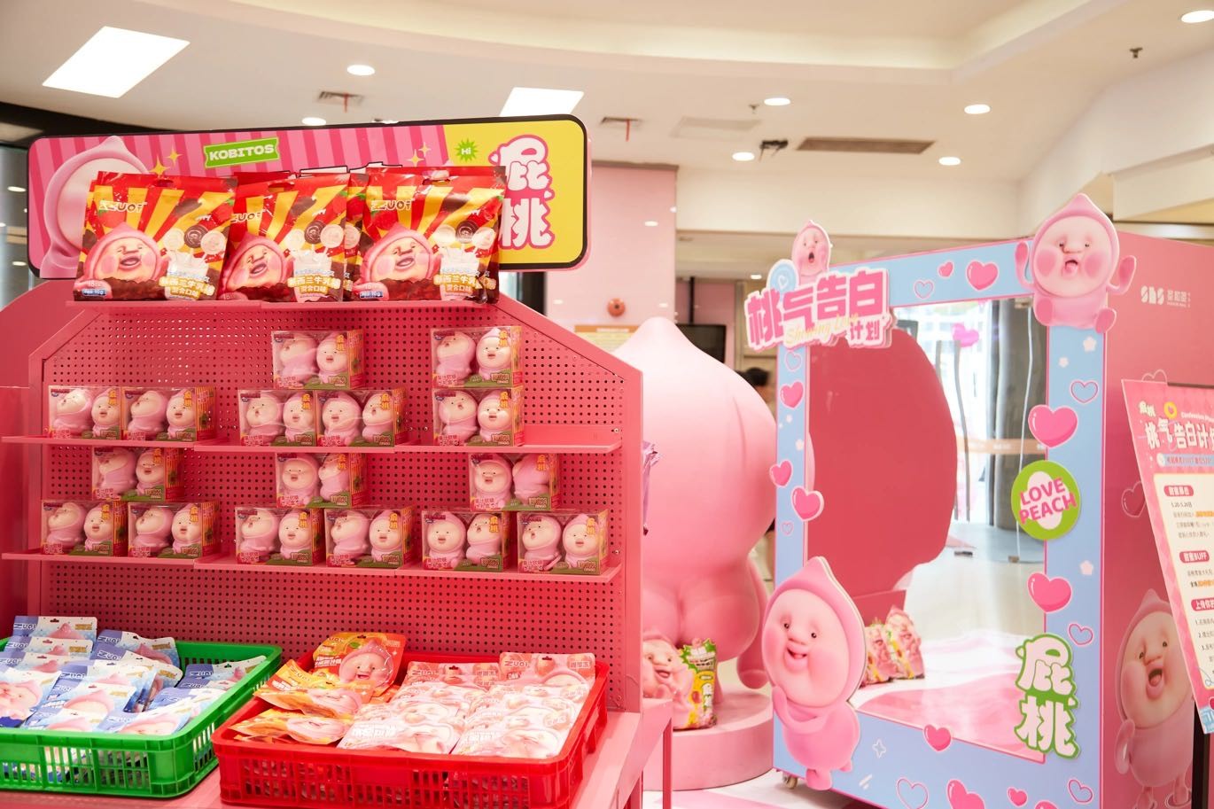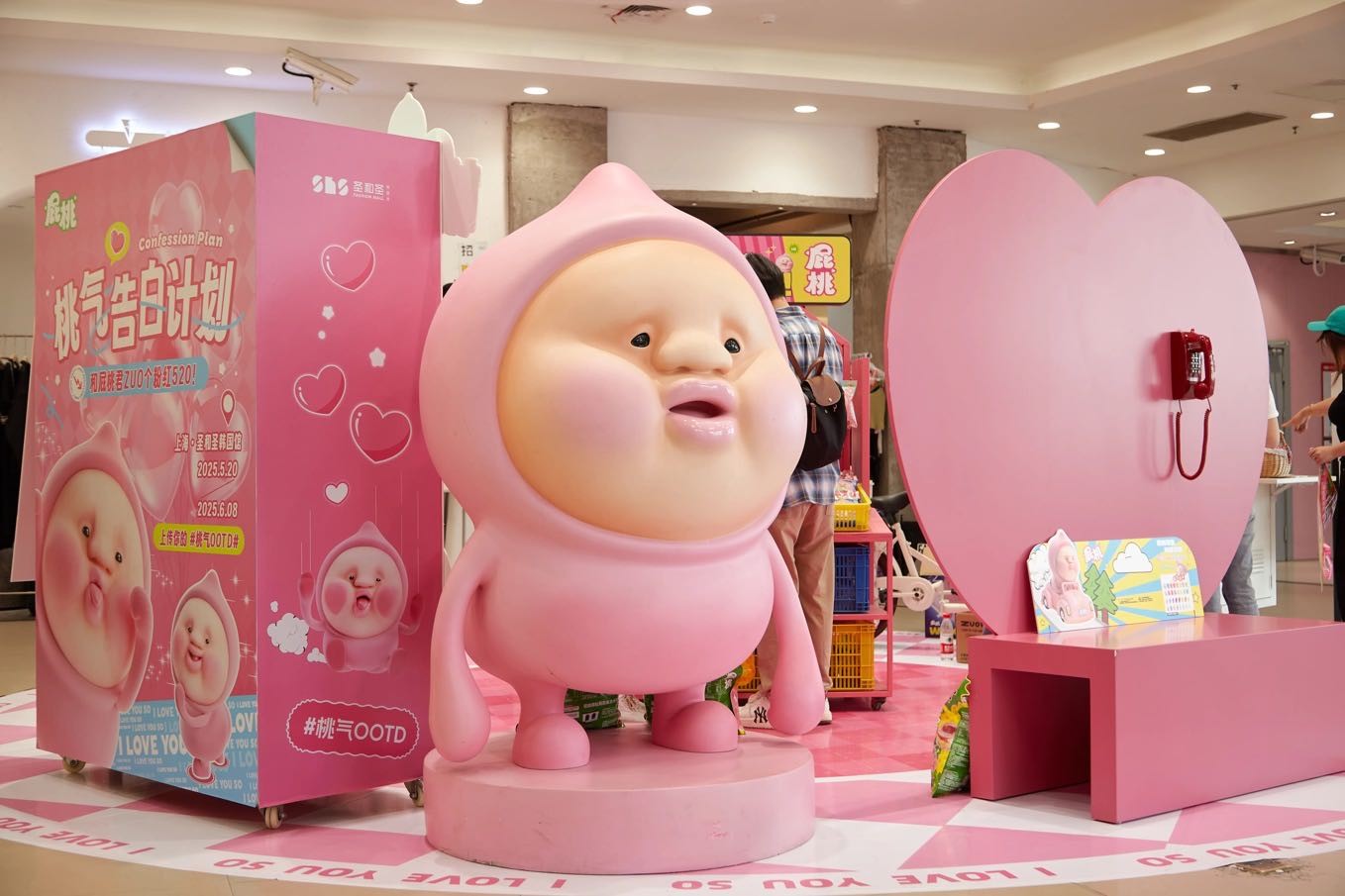 520期间,圣和圣韩国馆一楼变身“桃气星球”,以“屁桃君”这一深受年轻人喜爱的IP为核心,打造了一场极具特色的快闪活动。活动现场,粉色的装饰、可爱的屁桃君IP形象以及各种互动装置,瞬间将整个商场变成了一个浪漫的梦幻世界,吸引了众多年轻消费者前来打卡。