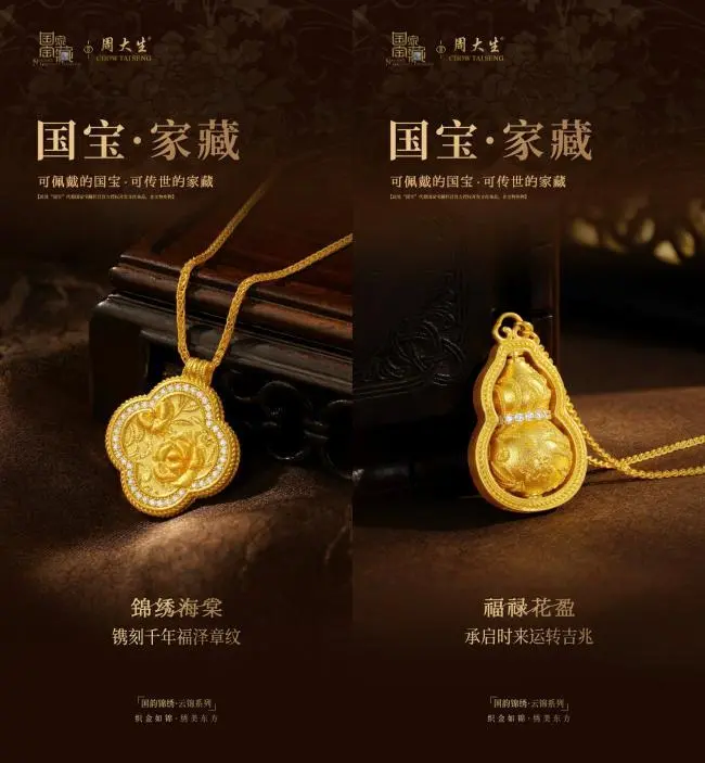 而周大生×国家宝藏品牌的发展,以与顶级文博IP《国家宝藏》的深度合作为核心,匠心推出一系列国宝文化典藏金品。通过这一合作,品牌持续将中国不朽文明与千年文化精粹融入现代生活,让其得以藏入万家。这些金品萃取了国宝文化精粹和中国传世技艺,在央视总台《国家宝藏》栏目IP的加持下,尽显中国美学典范。从国宝文化精粹出发,融合现代美学设计,周大生×国家宝藏品牌打造出的国宝文化典藏金品,不仅具备可点睛、可品鉴、可家藏、可传世的功能价值,更承载着中国文化自信与认同,传递“国之盛世、家之兴旺、爱之圆满”等精神与情感内涵。每处细节都透露着东方美学的独特魅力,为消费者带来独特的文化珠宝体验。
