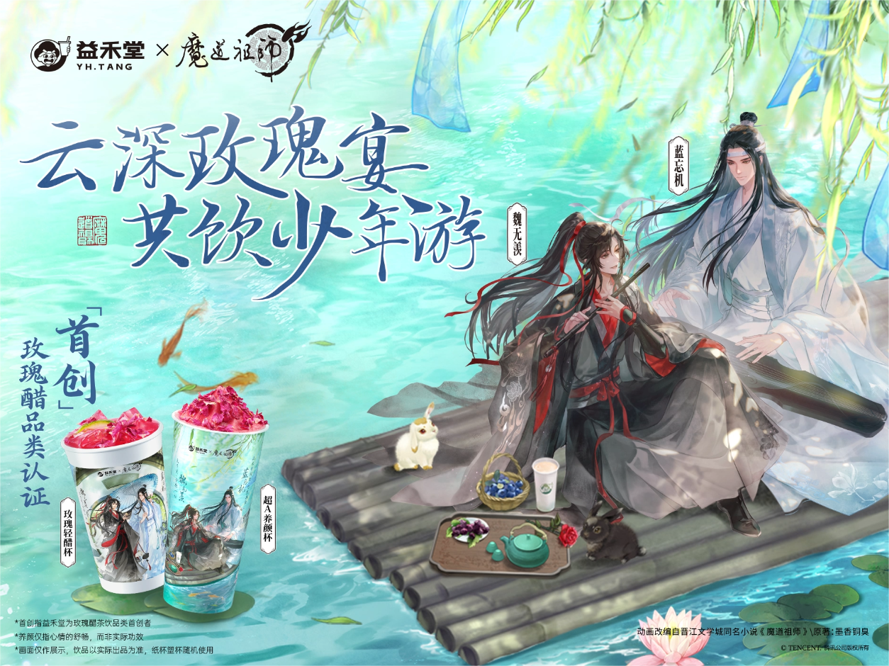 在推出本次新品之际,益禾堂携手国民级国漫IP《魔道祖师》动画跨界合作,推出重磅联名企划“云深玫瑰宴 共饮少年游”,活动上线后迅速引爆市场热度,全国多地门店外排起长龙,线上小程序订单量短时间内便突破16万单。