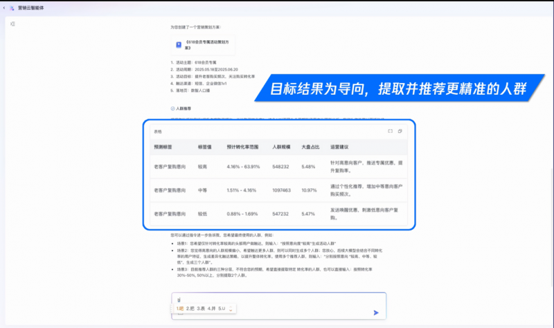 以一场“618会员复购活动”为例,传统模式下需要多部门协作数周才能完成策划,而借助营销云智能体,企业只需输入核心目标,系统即可自动拆解任务、圈选人群、匹配权益,并生成个性化内容。