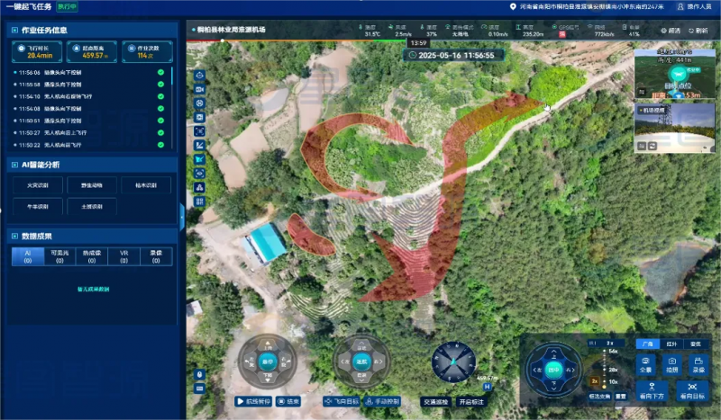 低空智航飞行平台森林防火巡检以“无人机+AI+物联网”为核心技术架构,构建起全域覆盖、智能协同的森林防火网络。火情发现时间从2小时缩短至8分钟,森林过火面积同比大幅下降。在硬件层面,部署多旋翼、垂直起降固定翼无人机及智能机巢,搭载双光摄像头、热成像仪、激光雷达等设备,实现自主巡航、精准降落、夜间监测。在软件层面,集成低空飞行服务平台,融合气象数据、林区地图、历史火点等信息,支持航线智能规划、火情自动识别、态势模拟推演。