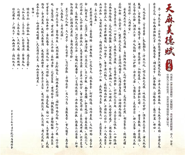 “茅台与天麻,同饮赤水河,共承天地魂。” 作为《茅台厚德赋》的创作者刘长焕现场解读创作初心时说,在探访乌蒙山天麻基地时,被 “群山巍巍、赤水汤汤” 的生态震撼,发现天麻 “隐于山野而济世” 的特质与茅台 “恪守匠心而泽民” 的精神同源共魂。他以 “天地合一” 的东方哲学为内核,在《天麻美德赋》中赞颂天麻 “灵性、隐涵、端正、通平、共和” 的德性,既致敬《神农本草经》的千年传承,更点题贵州两山天麻集团 “守护生态、科技赋能” 的时代担当。