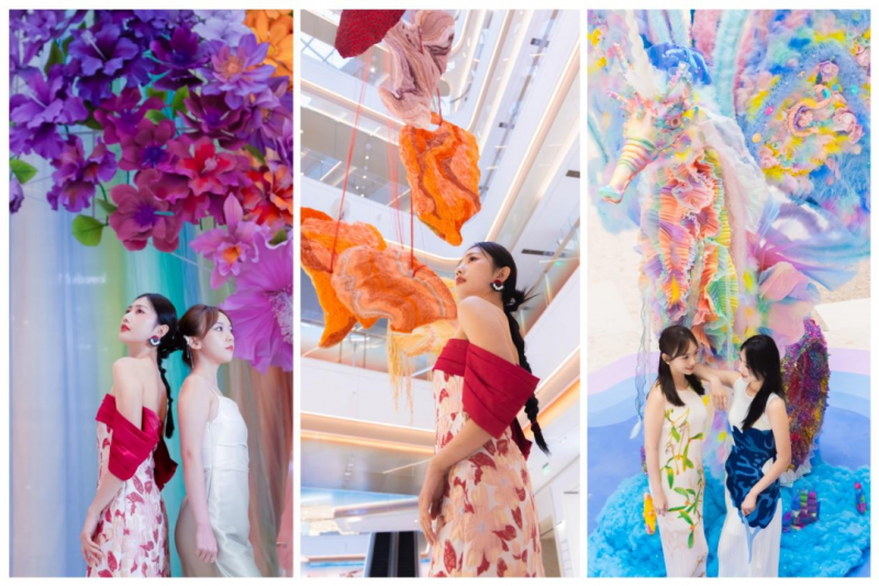 艺术展呈现日、月、星辰,花、鸟、兽、虫、鱼,霞、虹等系列主题美陈与装置,通过艺术创作+视觉美化,让顾客能够慢下来,感受人文自然与公园城市生活,呈现温江“成都后花园”的宜居宜业属性。