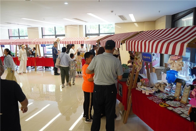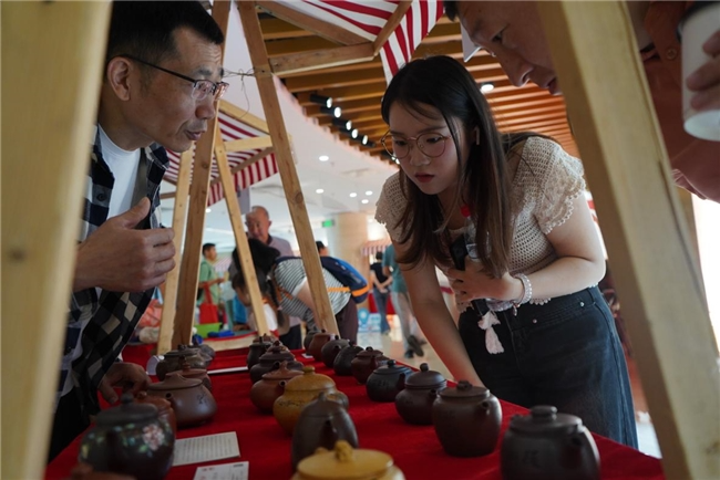 在展示区,设有三十余个来自北京、天津、河北和内蒙古的非遗及文创作品展位,共展示作品百余件,既有点翠首饰的流光溢彩、榫卯制作的精妙绝伦、剪纸技艺的灵动精巧,也有透射着浓浓青春气息的校园文创、铁道文创、工艺品文创等作品,还有契合端午时节的五彩手绳制作,参加市集的青少年朋友有的驻足欣赏,有的动手体验,在现场忙的不亦乐乎,家长们也纷纷在现场“淘宝”。