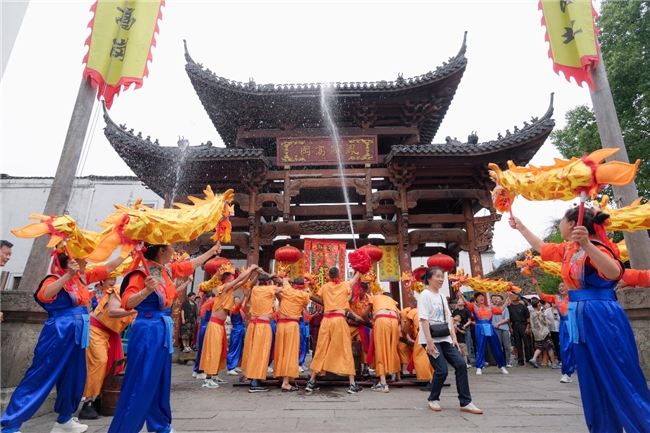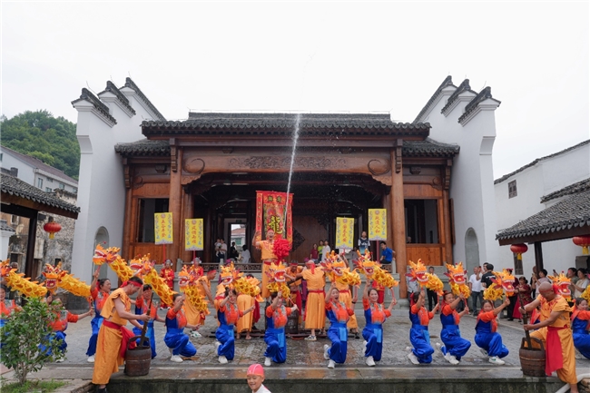 活动期间,“射洋龙民俗大巡游”每日三场,成为串联古村青石板路的流动风景线,旗牌、锣鼓、手龙开道,洋龙喷水祈福,这一活态展演不仅再现了民俗文化保护成果,更成为吸引游客、激活古村旅游的核心吸引力。“古村漫街奇遇记”巧妙地将叶浅予《富春人物画谱》融入现实场景,理发店、邮局、电影院等旧时风貌与村民、演员共同营造出浓郁的怀旧氛围和烟火气息。