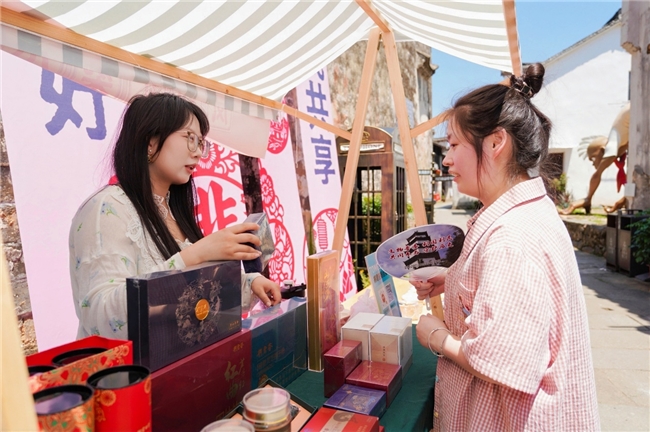 西边厅广场的“漫街喜市·遗探究竟”非遗市集,成为非遗资源转化为经济效益的直接窗口。非遗美食油炸馃、灰汤粽香气四溢,灯彩、面塑等文创产品琳琅满目,让文化变得“可带走”,为游客留下舌尖与指尖的双重记忆。晚间的桐庐越剧专场展演不仅丰富了夜间文化供给,更延长了游客停留时间,拉动了周边消费,实现了文化效益与经济效益的双赢。