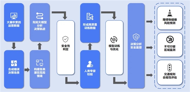 基于此需求迭代,先知大模型构建了一套独立于传统自动驾驶模块化链路系统的冗余安全机制,专门对规划决策进行实时异常监督。通过历史积累的实际运营数据以及公开的事故数据,技术团队系统性地合成了各类反事实决策场景数据库,包括各种潜在的碰撞风险、车辆误入非道路区域以及违反交通规则的情形。这种合成方法解决了现实驾驶中危险场景罕见导致的数据稀缺问题,为模型提供了丰富的训练素材。模型通过“合成→判定→校验→训练”形成闭环迭代:首先对合成轨迹进行安全性预判,再由专家团队标注验证,最终将验证后的数据集重新纳入训练集。