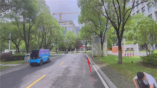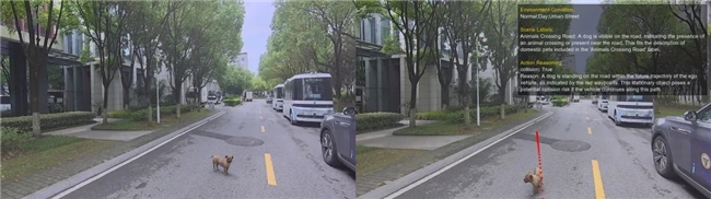 以实际场景为例,在无人驾驶车运行过程中,面临突然出现小狗,或者碰撞路沿的潜在风险(如图6、图7),先知大模型会对这些决策轨迹进行兜底判定,确保决策的安全性与合理性。