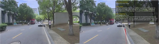 通过一系列技术突破,先知大模型的能力边界实现了质的飞跃:从传统的闭集任务(如环境感知、车辆识别和场景理解)扩展到更为复杂的开集问题领域,包括对自车决策轨迹的全面分析能力;精确识别与预测多种复杂情境下的安全隐患:动态预测障碍物碰撞风险、监测车辆是否进入施工区或对向车道等不可行驶区域、评估驾驶行为是否符合各类明文和潜规则的交通法规。通过这种全方位的安全监督,先知大模型成为自动驾驶系统的智能守护者,为实现安全可靠的自动驾驶提供了强有力的技术支撑。