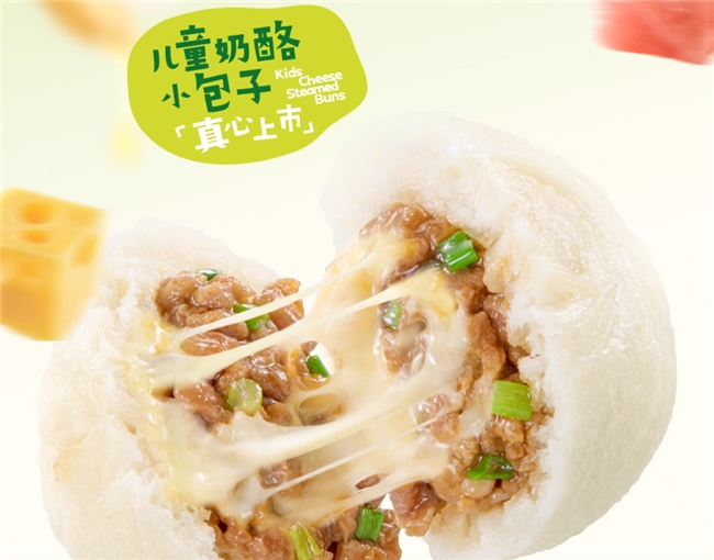儿童奶酪小包子用新疆天山小麦粉与麦芯小麦粉制皮,馅料含超58%黑猪肉、超30%新西兰进口马苏里拉奶酪;儿童奶酪烧卖以一级圆糯米等为基底,加入超13.2%新西兰进口奶酪,馅料含量超75%;儿童奶酪流心小烤肠采用100%无抗肉,添加超10%爱尔兰原制车达奶酪,每一口都是营养暴击。