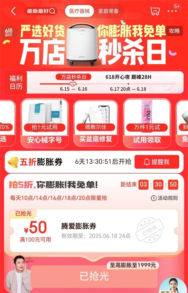 今年京东买药618火热进行中!京东买药医疗器械专场特别推出“膨胀券”优惠,券面价值至高可膨胀至满2000减1999元!这相当于近乎免单的极致优惠,叠加国补、品牌折扣及免单活动,助用户以超乎想象的低价,轻松升级家庭健康装备!