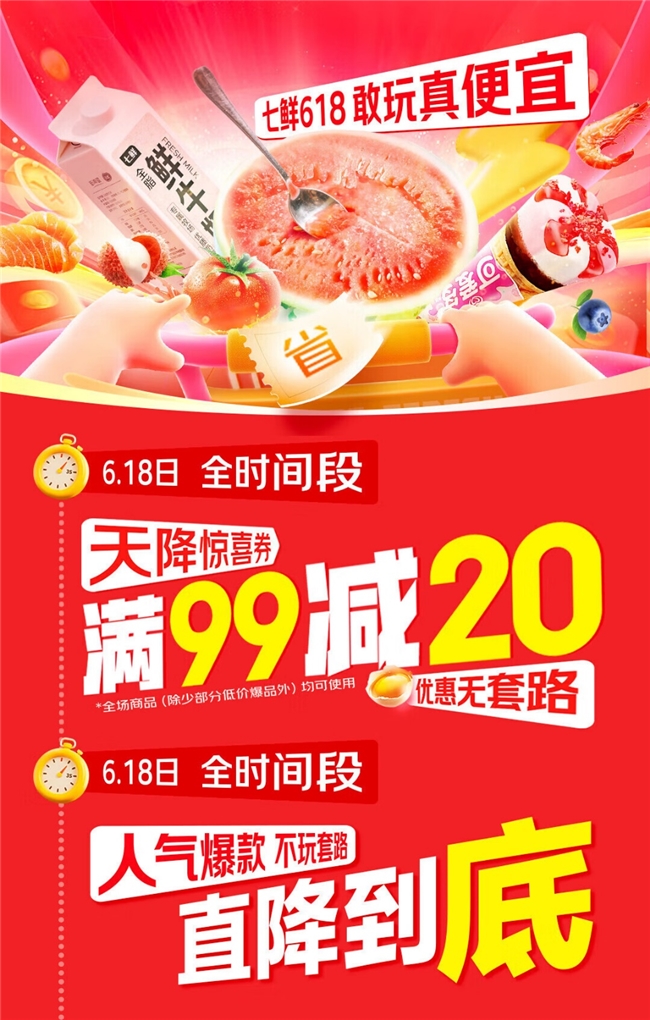 京东七鲜618终极福利来袭!6月18日,京东七鲜全时间段火力全开,除少量人气爆品价格直降外,全场近万款商品享“满99减20”。每人可使用三张即时到账的“满99减20”优惠券,下单立享折扣,无需复杂计算。从应季水果到鲜活水产,从品质肉禽到家居好物,搭配最快30分钟送达的即时服务,轻松满足夏日味蕾与家庭所需。