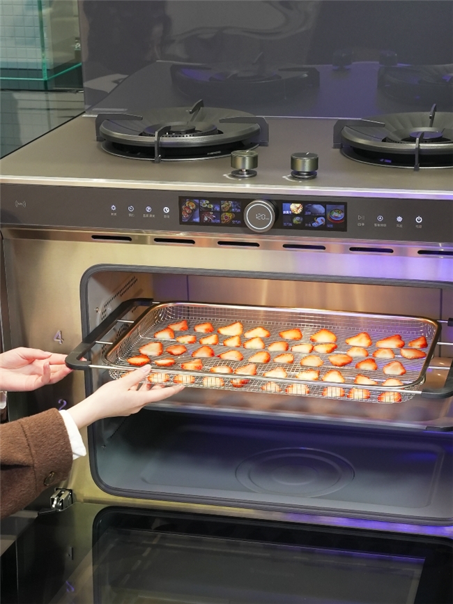 虽然应用场景宽泛,但火星人Q60蒸烤一体集成灶各项功能的实际使用体验都非常出色。燃气灶部分,它5.2kW宽幅火力技术精准控温,既能适应中式爆炒的浓郁风味,也能满足西式烘焙的细腻要求。功能上,独特的“低嘌呤蒸汽炖”模式可在保留食材营养的同时,有效减低食材中嘌呤含量,满足健康饮食需求。而“趣味果干烤”模式则将水果变身为芒果干、苹果脆片等创意零食,简单操作即可激发美食灵感。