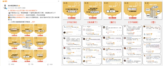 本次活动中最引人关注的便是张小泉官微发布的“猜emoji赢大奖”趣味互动,通过将各种类型的emoji视觉符号组成谜题,在参与难度不高的同时激起了网友们的好奇心。多位网红博主纷纷参与其中,引导网友们关注张小泉套刀的亮点,并成功助力话题快速破圈。网友们在猜谜的过程中顺理成章地被科普了“生熟不分”“刀架积水”等厨房用刀卫生实用知识点。据统计,有超过3万的网友参与互动,阅读量数据突破2139万,这一次线上互动成功为张小泉的618活动打响第一炮。
