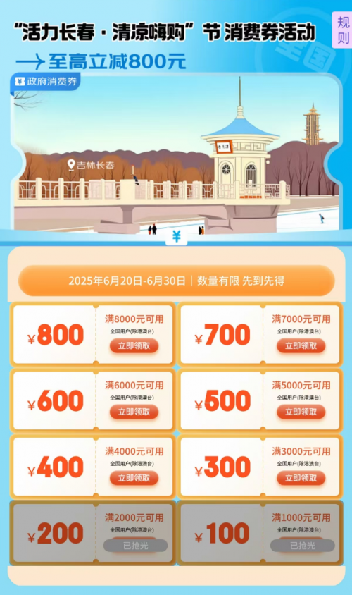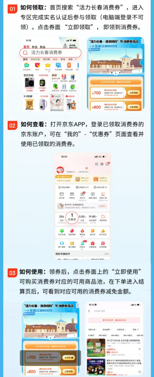 领取的步骤非常简单,用户打开京东APP搜索“长春消费券”进入活动页面后,完成实名认证后即可参与领取,随后点击券面上的“立即使用”就能进入消费券对应的可用商品池,在下单进入结算页后,可看到对应可用的消费券减免金额。本次长春消费券活动将持续至6月30日,活动期间长春消费券于每日0点开放领取,截止发放时间为当日23:30,全周期每位用户每个面额消费券限核销1次,消费券有效期截止于领取当日23:59,过期未核销自动作废,用户可次日再领取。
