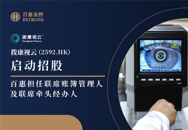 Cloudbreak Pharma Inc.(下称“拨康视云”),股票代2592.HK,于2025年6月24日至6月27日期间招股,百惠金控团队担任联席账簿管理人及联席牵头经办人。