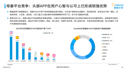 据易观往期相关报告显示,母婴垂直平台的竞争格局已进入稳定期,以妈妈网孕育为代表的头部应用,在用户心智与认可上已形成较强优势。妈妈网孕育APP在月度活跃用户规模、行业活跃渗透等维度均远超同类产品,保持领先。