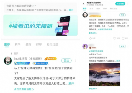 此次“被看见的无障碍”活动中,Soul还鼓励用户分享身边的无障碍设施及对平台优化的建议,以普及信息无障碍理念。活动话题下,用户们积极讨论线下无障碍设施的作用,分享科技对视觉障碍人士生活的改变,形成关注无障碍环境的良好氛围。
