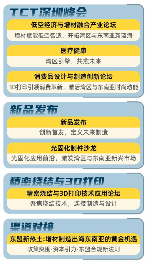 TCT深圳展不仅是一场制造业技术盛会,更是联结增材制造创新力量的开放平台。精密烧结与3D打印应用论坛、新品发布会与光固化制件沙龙、东盟新热土出海专场,以及涵盖低空经济、医疗健康、消费品与时尚的三大主题的TCT深圳峰会,将聚焦增材制造技术的实际应用、产业融合与未来机遇。