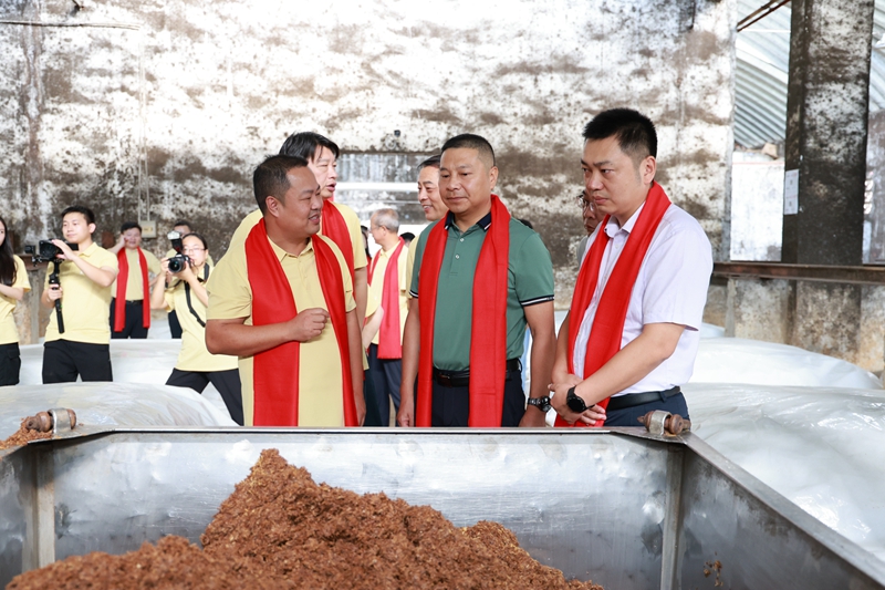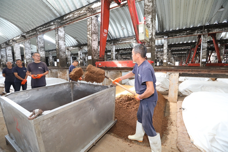 金秋开窖,佳酿天成。与会领导及特邀经销商代表、消费者代表移步窖池区,秦玉龙、曾洋共同揭开红绸,开启稻花香2025年秋酿的第一口窖池。经验丰富的酿酒师傅上前,娴熟地铲去窖池封泥,开始分层起糟,整套动作一气呵成。一股股混合着窖香、糟香、酯香的气息扑面而来,令观者无不沉醉其中。