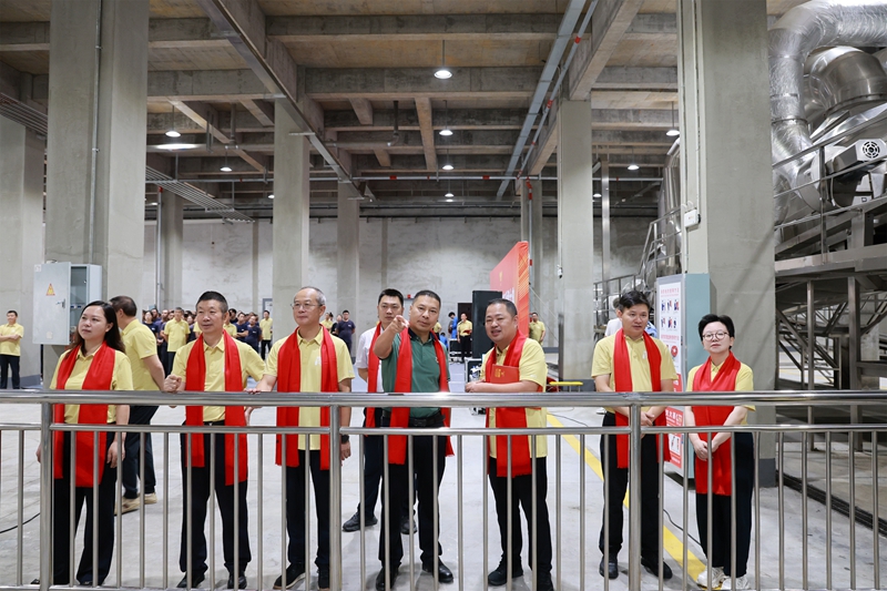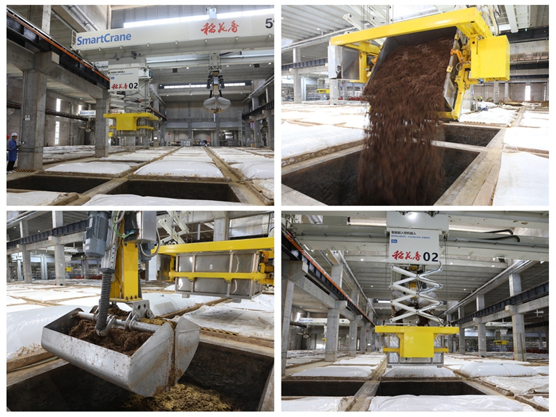 秦玉龙鸣笛发令,启动馫香型白酒生产酿造。智能起入窖机器人根据指令平稳运行,投窖、起糟、转运……整个过程行云流水,充满了现代工业的美感与力量。领导及嘉宾移步至右侧安全护栏旁,一同观摩智能行车入窖、起糟工序。