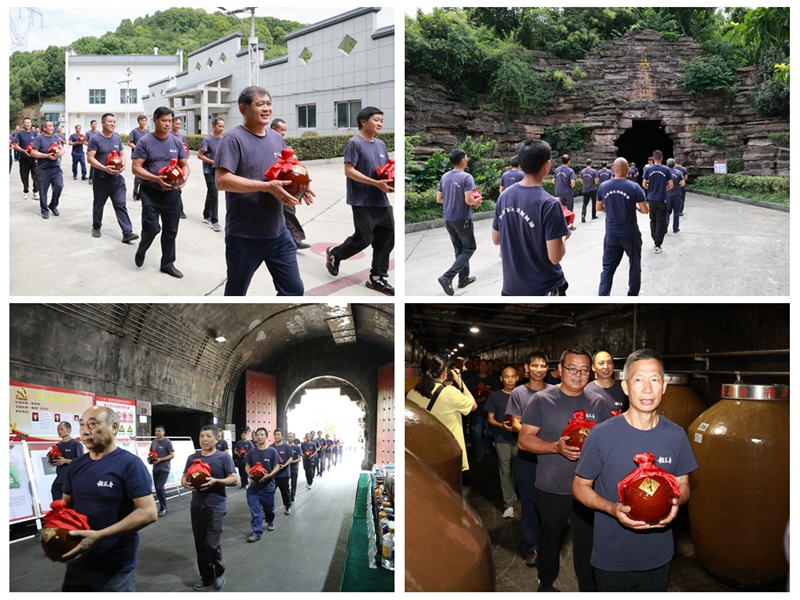 让时光入酒,以岁月藏香。稻花香以封藏之礼,致敬岁月与匠心。活动现场,秦玉龙、曾洋、谢永文、苏顺平、陈小林共同移步至台前,为凝聚天地精华与匠心智慧的美酒进行封坛。在所有人期待的目光中,酿酒师傅们应声上前,抱起覆上红绸的酒坛,如同护送珍贵的宝物一般,站成一条庄严的队伍,向着象征岁月与沉淀的藏酒洞方向进发。