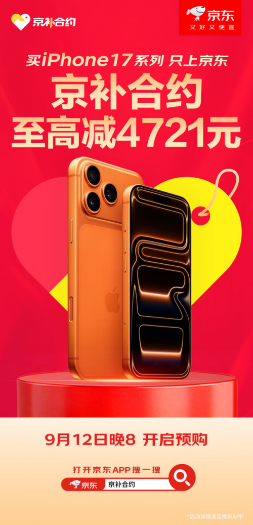 9月12日晚8点,iPhone 17系列开启预售,同时发布的新款Apple Watch和AirPods Pro 3也已开启预售。如果想以专属低价入手这些Apple新品,可以来京东通过“京补合约”下单,购买时办理指定话费套餐,不仅可享受几百到几千元不等的合约购机补贴,部分地区还可叠加国家补贴,一次入手新机、新号卡及超值套餐。来京东APP搜索“京补合约”即可进入活动会场。值得一提的是,作为线上iPhone 17系列合约购机唯一办理渠道,京东携手运营商为消费者打造iPhone 17系列专属福利,用“京补合约”换新至高减4721元。