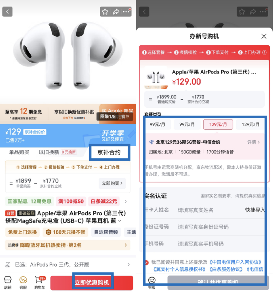 以AirPods Pro 3为例,一起来看看如何通过“京补合约”下单。在Apple产品京东自营旗舰店内AirPods Pro 3的商品详情页,点击“京补合约”,然后点击立即优惠购机,选择补贴套餐,输入身份信息,勾选相关协议,就能下单享受补贴了。线上点几下完成下单后,京东快递小哥将上门协助消费者完成信息核验和套餐激活等流程,一站式搞定新机、新号卡、新套餐,足不出户就能省钱购机。