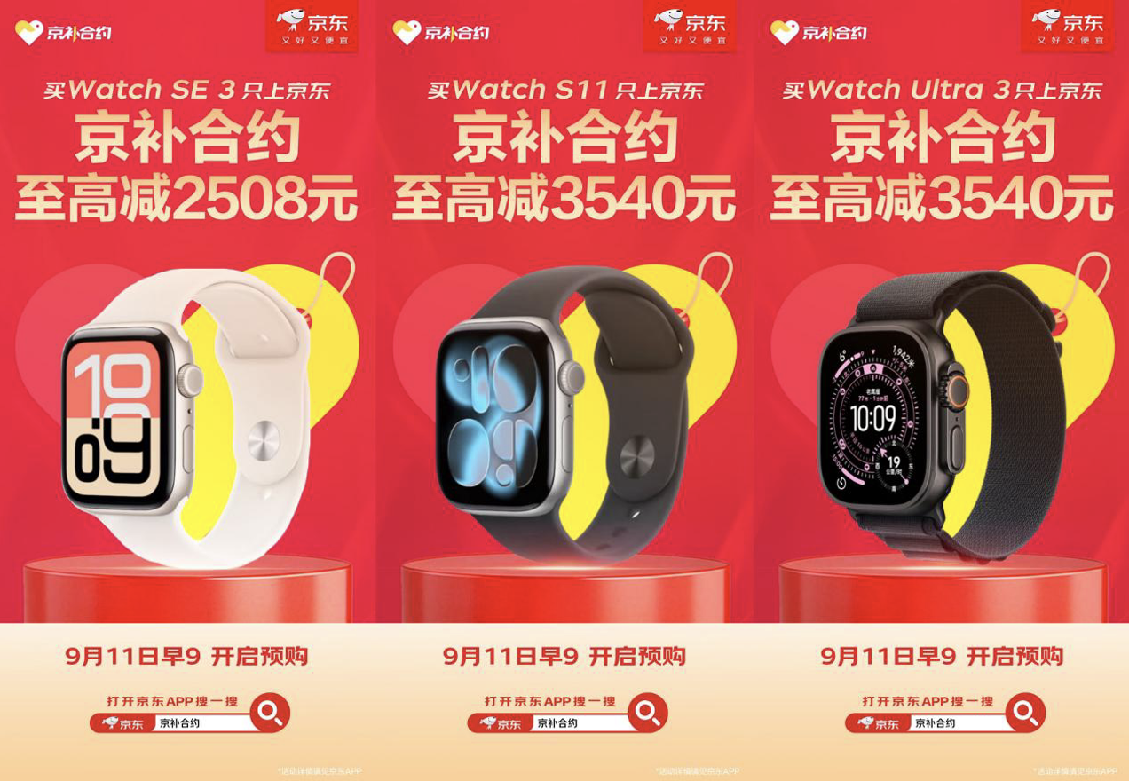 新款Apple Watch系列包括Apple Watch SE 3、Apple Watch Series 11、Apple Watch Ultra 3,起售价分别为1999元、2999元、6499元。Apple Watch SE 3作为入门级产品,配备了强大的Apple Watch芯片S10,拥有常亮显示屏,并支持手腕轻弹等手势操作,还将具备高血压通知功能和睡眠评分系统。Apple Watch Ultra 3显示屏经过大幅升级,采用了Apple“最先进的技术”,亮度更高、边框更窄、屏幕面积更大,新增的5G蜂窝支持以及卫星连接功能,让用户在偏远地区也能保持与外界的联系。消费者到京东通过“京补合约”下单Apple Watch SE 3,办理话费套餐可享京补合约至高减2508元;下单Apple Watch Series 11可享京补合约至高减3540元;下单Apple Watch Ultra 3可享京补合约至高减3540元。