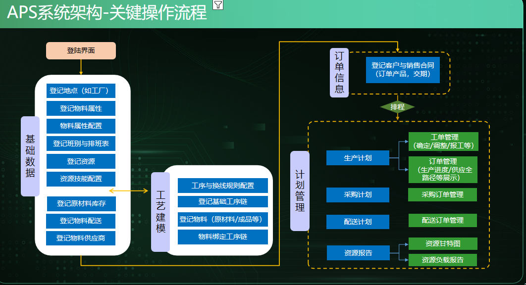 APS(Advanced Planning and Scheduling,先进规划与排程)是专注于 “生产计划精细化优化” 的工具,核心目标是在 “有限产能”约束下(如设备数量、人员班次、工艺顺序),制定最优的生产排程方案,平衡“订单交期”“资源利用率”“成本控制” 三大目标。其核心功能围绕“计划优化”展开,典型模块包括: