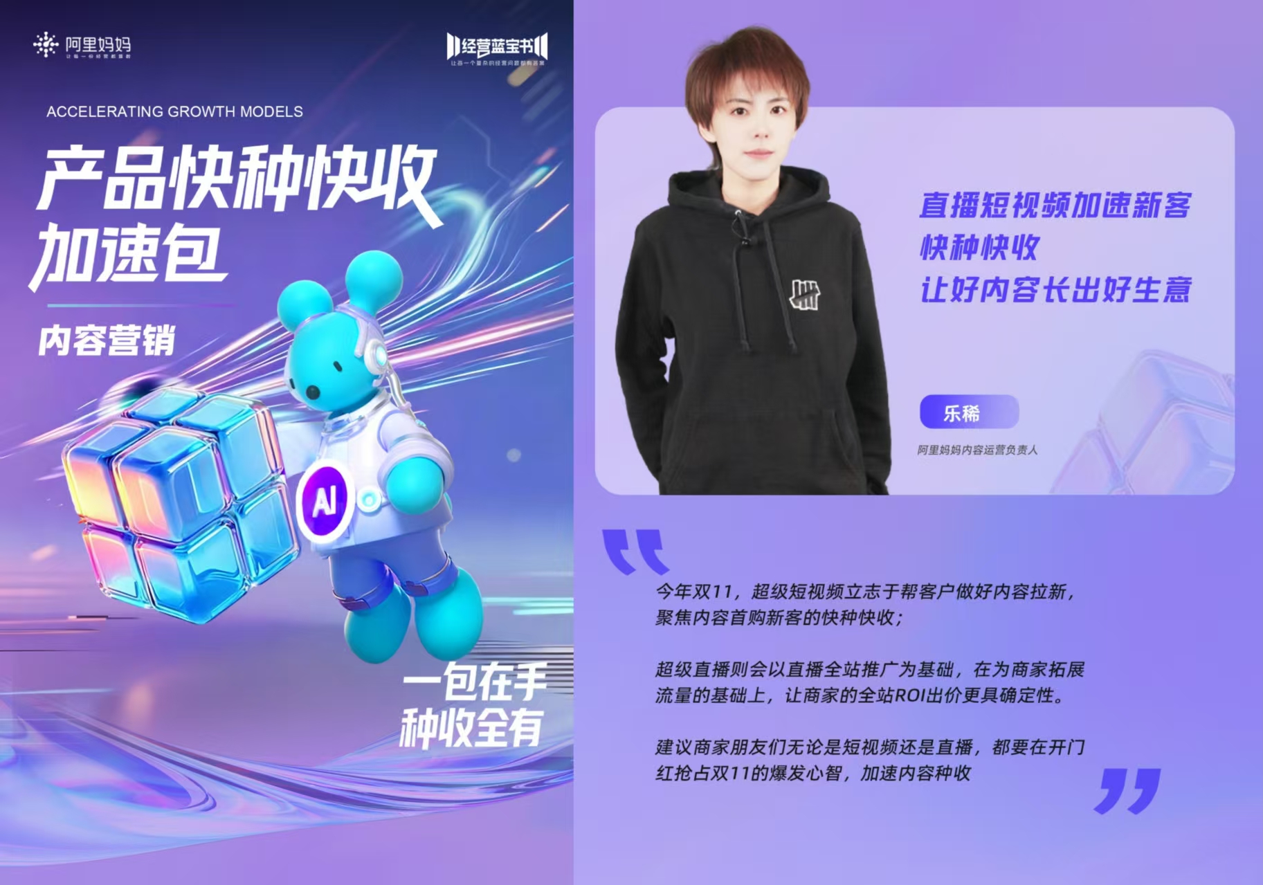 为了帮助商家抓住红利,依托阿里妈妈AI能力,内容营销通过超级短视频与超级直播的双轮驱动,结合短直联动方案,实现从创意洞察、智能投放到转化沉淀的全链路提效。同时,内容营销也推出了专属激励扶持,超级直播商家投入越多,激励流量就越多,普惠全量商家。