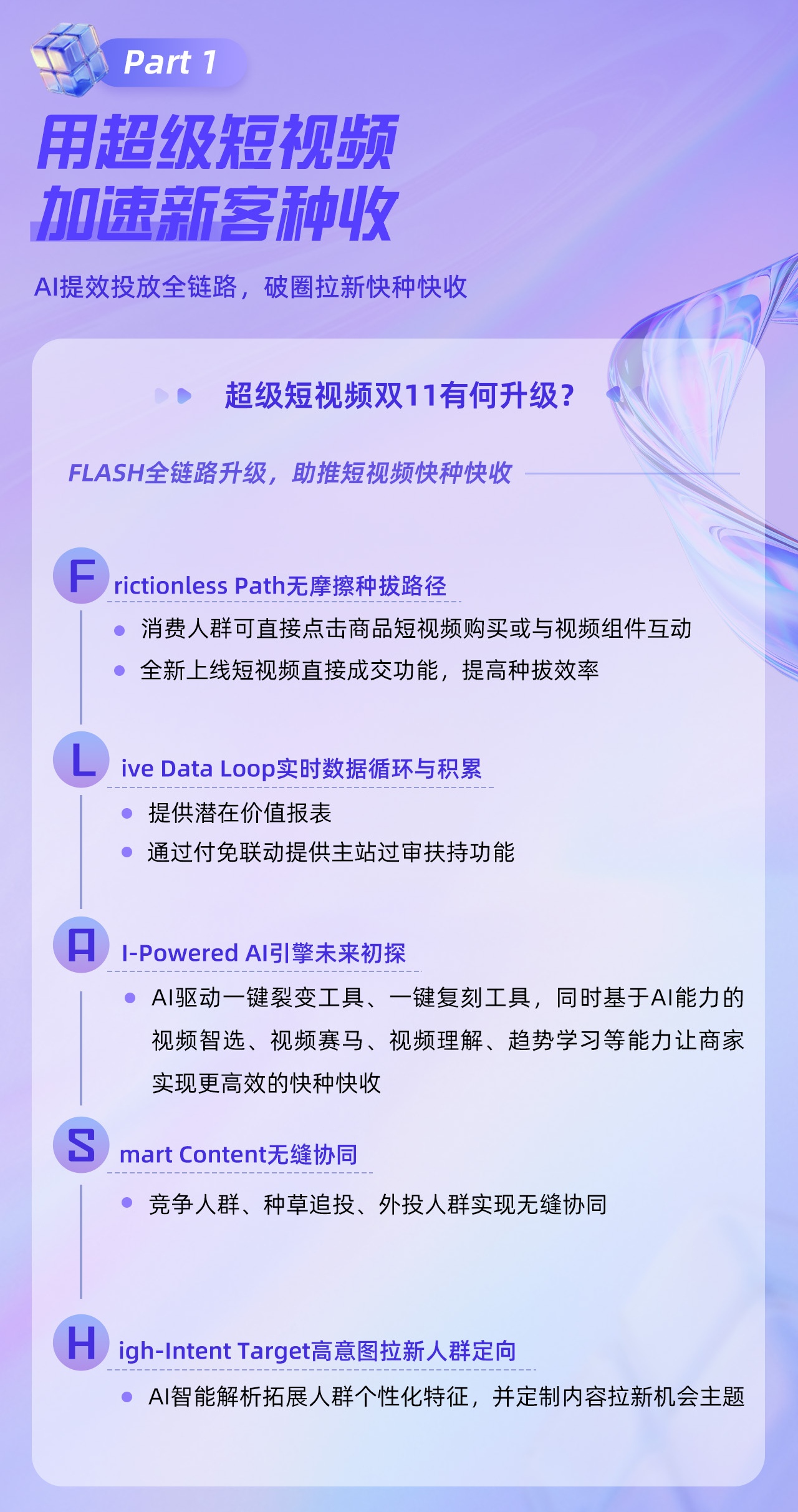 市场迸发的消费活力、产品能力的升级提效,再加上每月2次超级88的经营节奏变化,注定了今年双11商家需要采取全新的内容营销策略,乘上这波平台助推的全域增长东风。查看下方《经营蓝宝书产品篇——产品快种快收加速包》,即刻解锁双11内容营销投放攻略!