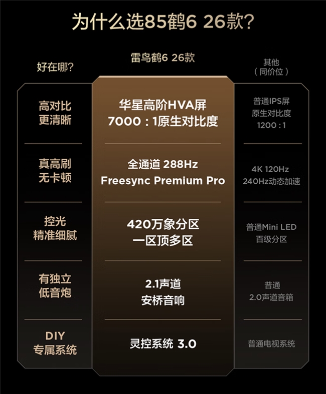 雷鸟鹤6 26款电视已全面上市,国补后价格分别为:85英寸5199元、75英寸3799元、65英寸2999元、55英寸2499元。