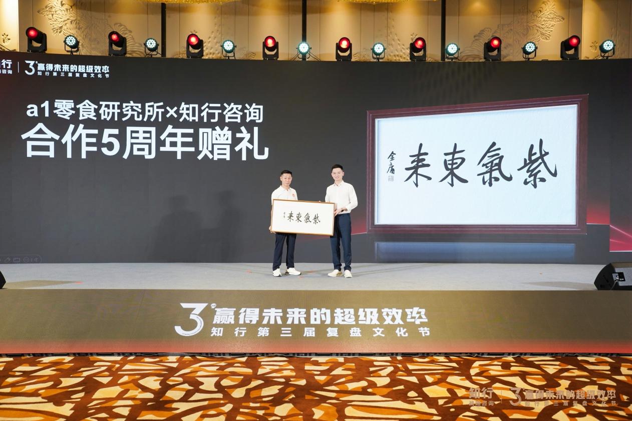 (知行咨询创始人李文亮(右一)为a1零食研究所董事长周炜平(左一)送上五周年合作赠礼)