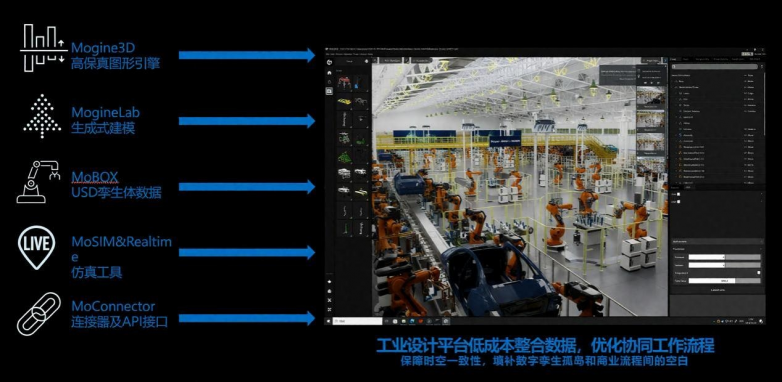 ——Mogine 3D超写实实时渲染引擎,该引擎融合光线追踪与物理级渲染技术,全面支持USD标准,打通设计、生产与内容创作流程,为高质量3D视觉提供强大底座。可精准还原复杂工业设备的结构与材质,为产品设计、虚拟工厂等场景提供沉浸式视觉支持;