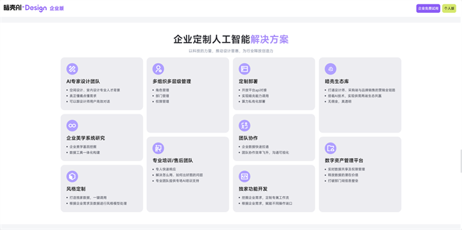 针对家居品牌端在精准获客、宣传物料制作、数据分析及预判等方面的痛点,暗壳AI也推出了针对性解决方案,比如“暗壳AI生态库”,以场景赋能、流程嵌入、生态互联为核心逻辑,链接设计师与品牌端,实现供需两端的价值提升与共赢;“品牌企业库”以专属管理、精准触达、数据驱动为核心,构建专属的产品数字化管理与设计师协同平台。在营销宣传方面,暗壳AI可快速生成高质量美学物料和时尚视觉内容,极大降低品牌营销成本。除此之外,暗壳AI还可提供企业定制人工智能解决方案,根据企业具体需求提供针对性功能和技术服务,如:API + 定制,深度训练合作等。