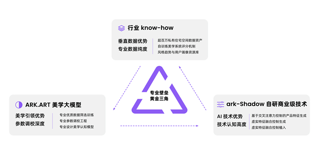 暗壳科技 CEO 黄燕虹介绍:“在垂直领域AI 产品研发中,我们构建了‘专业数据纯度 × 参数调校深度 × 技术认知高度’的技术范式。通过对设计行业结构化数据的深度挖掘与精细标注,暗壳AI打造出通用AI难以突破的专业壁垒,形成‘行业认知 - 技术创新 - 应用价值’的核心闭环。依托行业 know-how 沉淀,公司自主研发的ARK・ART 美学大模型,结合ark Shadow 商用级商品精准植入技术,从美学生成逻辑到商业场景落地形成完整技术闭环;自研基于扩散模型(Diffusion Model)框架的LVLM模型(Latent Visual-Language Model,潜在视觉 - 语言模型),经百万级行业标注数据训练,在生成内容的‘专业美学契合度’上达到行业领先,更贴合专业设计师的创作审美;同时,基于交叉注意力机制(Cross-Attention Mechanism)的特征识别与多模态融合算法,实现商品在场景中的高精度、自然化植入,为产业端带来AI时代的高效赋能。面向未来,公司将持续运用独家行业 know-how及产品sense,打造基于MoE(Mixture of Experts,混合专家模型)架构的‘专业设计师 Agent’,持续强化在垂直领域的技术领先性与场景话语权。”