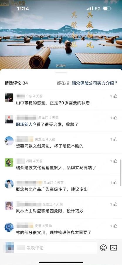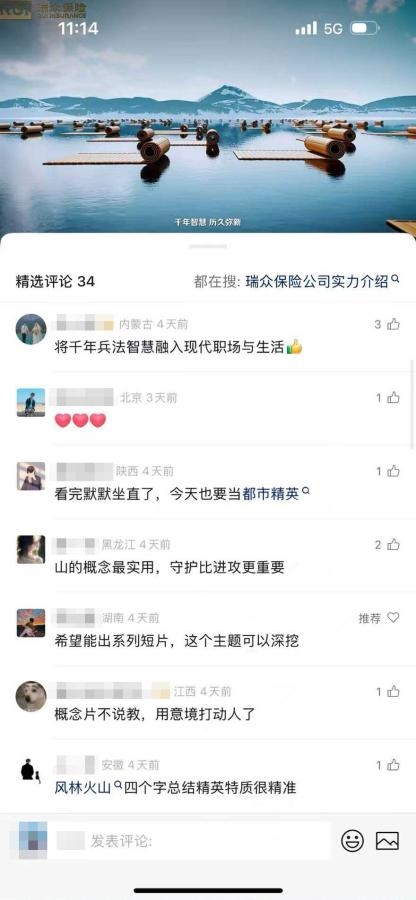 此次都市精英系列文创的推出,不仅是瑞众保险品牌传播的创新实践,更是其面向未来、助力构建中国特色金融文化的重要探索。概念片发布后,不少观众对影片给予了积极反馈——有观众表示“概念片不说教,用意境打动人心”,也有观众认为“‘风林火山’四个字精准总结了精英特质”,更有观众表示“看完想买份保险是怎么回事……营销成功”。这些反馈充分表现出传统文化当代表达的生命力,也印证了唯有根植民族文化深处,品牌才能在新时代的浪潮中走得更远。