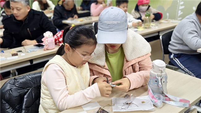 活动伊始,老师以生动的语言展开宋锦的故事,从南宋御用工匠的巧思凝练,到如今跻身世界非物质文化遗产的荣光,再到指尖下宋锦暗纹里藏着的东方审美,孩子们听得入神,仿佛触到了时光沉淀的细腻。手工制作环节,亲子家庭默契地投入创作。家长协助孩子对齐蝶翼形状的宋锦片,确保每一处边缘都贴合挂坠底胚的轮廓,孩子则专注地捏着彩色丝线,顺着底胚预留的小孔轻轻穿过,再绕回打结固定。丝线在亲子指尖流转,原本独立的宋锦片渐渐连成灵动的蝴蝶形态。孩子们举着挂坠,眼底满是雀跃,温情在丝线与锦纹间静静漫溢。