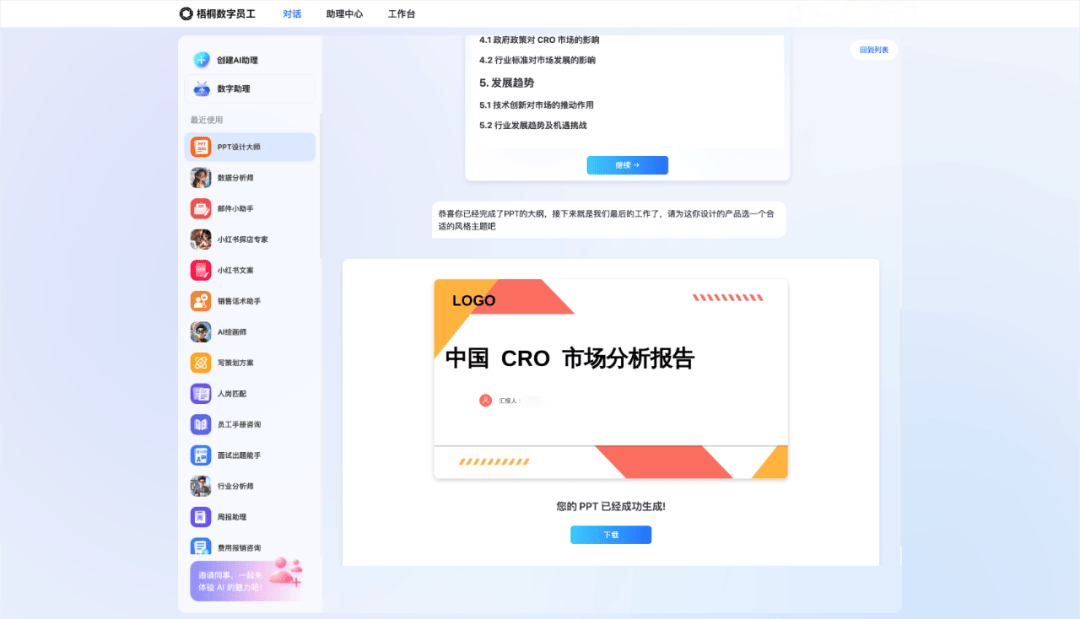 员工效率伙伴:集成PPT设计大师、Excel专家、中英文翻译官等实用工具,根据员工画像提供差异化服务,如为新员工推送详细操作指引,为资深员工直接输出成果文件,助力节省员工办公效率,快速完成工作任务。