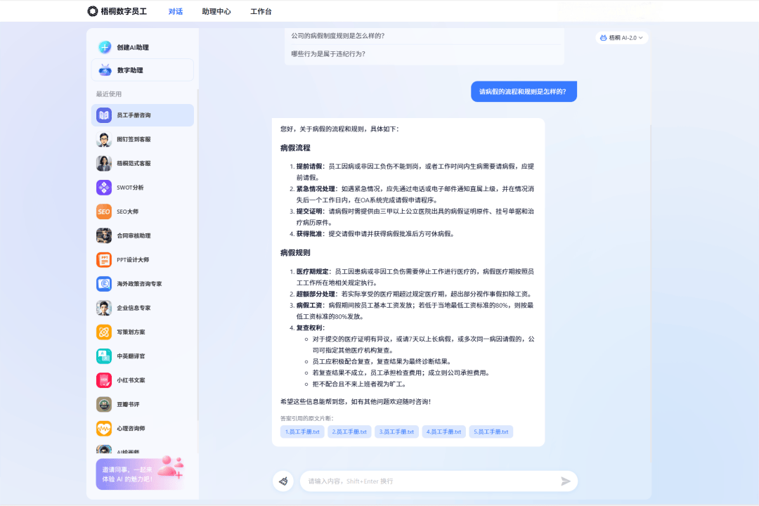 专利技术赋予梧桐数字员工跨领域知识融合与系统自动化集成能力,通过自然语言交互为不同角色(管理者、HR、员工)提供方式定制化工具集,更有海量开箱即用的AI工具可直接使用,显著简化工作流程、提升效率,进一步释放人力价值。