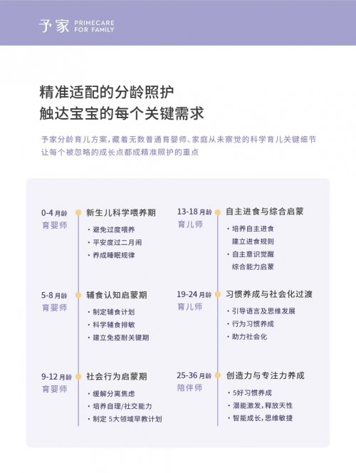 予家“分龄育儿”体系将0-36月龄育儿方案精准划分为6个阶段,进行“新生儿科学喂养期-辅食认知启蒙期-社会行为启蒙期-自主进食与综合启蒙-习惯养成与社会化过渡-创造力与专注力养成”的全阶段精细照护。方案的制定使得科学育儿从一个模糊的概念,细化为针对宝宝每个月龄“刚好需要”的精准养护,真正实现了从理论到实践的跨越。
