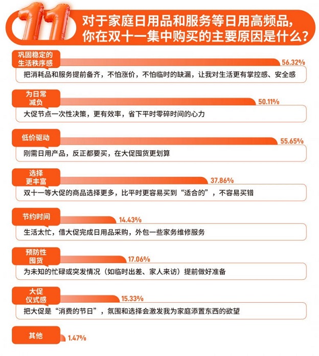 日前发布的一项面向3000名消费者的“2025年双11家庭消费调研”显示,家庭日用类消费在双11大促中占据绝对主导地位,高达65.89%的消费者将其列为每逢大促都会关注或购买的固定选项,超过家电家居、数码智能、服饰美妆等其他品类。消费者通过对高频使用的日用品进行有计划的准备,不仅满足了实用需求,更在心理层面获得了“生活可控”的安全感。