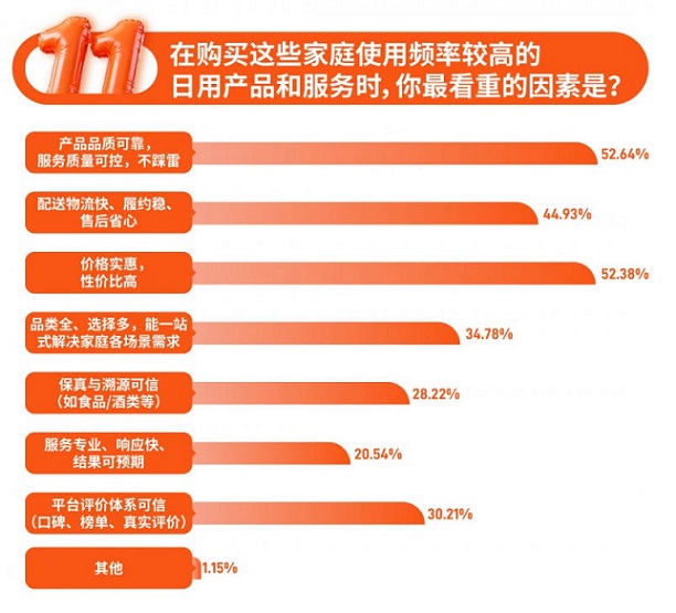 双11已步入第十七个年头,消费者的心态与行为模式也发生了深刻变化。越来越多的中国家庭将双11视为进行生活规划与品质升级的关键节点,其中日用百货与家庭服务类消费稳居“C位”,消费行为兼具计划性与实用性。这一转变背后,折射出的是当代家庭对“稳定秩序感”与“时间价值”的双重追求,以及在此基础上的理性决策。