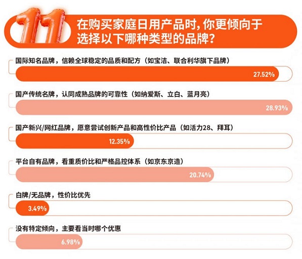 品牌选择呈现出多元化趋势,其中国产品牌总体选择率超过60%。立白、蓝月亮等成熟国产传统名牌与宝洁、联合利华等国际知名品牌共同占据主流,显示出消费者对具有历史积淀和品质保障的品牌有着较高认同。特别值得注意的是,京东京造等平台自有品牌以20.74%的选择率成为一股不可忽视的力量,消费者看重其质价比和严格的品控体系。