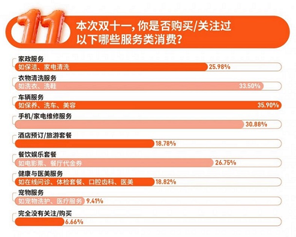 在具体的品类关注分布上,个人护理用品与家庭清洁用品并列成为最受关注的细分品类,食品类紧随其后,纸品、饮品等基础消耗品也保持着较高的关注度。与此同时,服务类消费正逐步从“可选”走向“刚需”。家政服务、家电清洗、维修护理等正被越来越多家庭视为解决家务难题、维持高效运转的优先方案或标配。在双11期间,高达93.34%的受访者表示已关注或购买服务类商品,显示出服务消费已深度融入家庭生活场景,成为不可或缺的组成部分。这种转变的核心原因在于当代家庭对“时间价值”的日益重视,通过购买专业服务解放时间,换取生活品质与心理舒适。