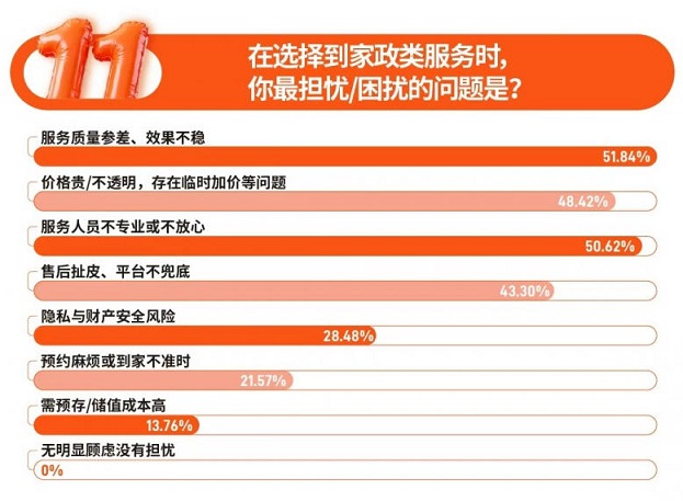 然而,服务质量参差、价格不透明仍是制约服务消费发展的核心痛点。在家政服务中,超半数消费者担忧服务质量与人员专业性;在家电清洗和维修服务中,服务质量差与价格问题同样突出。同时,“平台监管弱,出了问题投诉无门”与“售后扯皮、平台不兜底”也是消费者的重要顾虑,反映出部分服务平台在标准化、专业化及信任机制方面仍存在系统性问题。这些痛点共同构成了消费者在选择服务时的心理障碍,也预示着未来哪家平台能率先解决这些问题,就将在“品质竞争”时代占据先机。